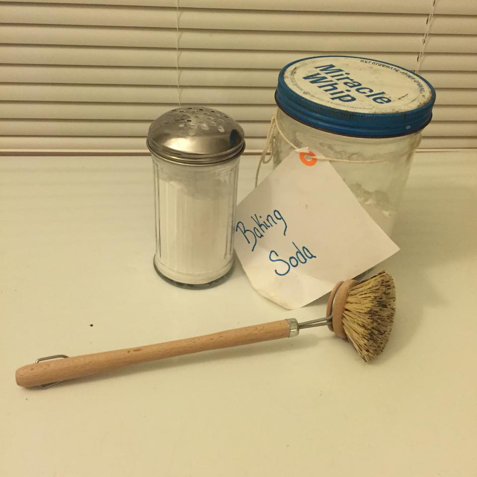 Instead of using a fancy broom or mop with disposable pads, I use a wooden broom with a metal dustpan that I bought secondhand. When I need to mop I use a rag (if you own a mop you could totally use it) and my vinegar solution to spot clean. For larger areas I use warm water mixed with some baking soda and a rag. I use the vinegar for small areas because it’s already in a handy spray bottle ready to spot clean. I use the baking soda for larger areas simply because it’s easier to buy in bulk for me so I would rather use more of it than my vinegar. You could easily use a solution of either for cleaning your floors.